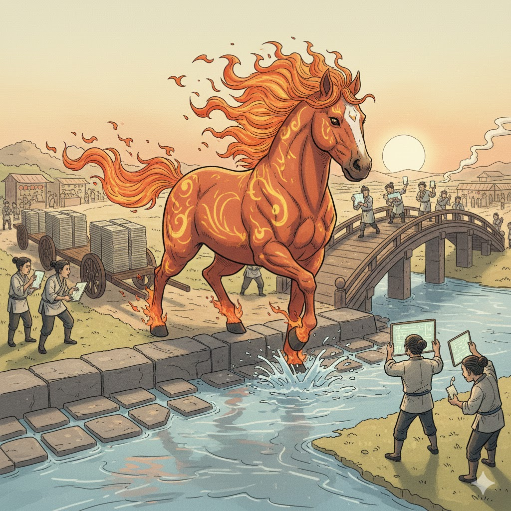 At daybreak, the Fire Horse enters the ford with a steady gait: bundles leave paper stacks to cross the digital bridges. Straps tightened, tack checked, and everyone now knows how to receive in the right format. May the Year of the Fire Horse carry you straight and clean: steady cadence, crisp transitions, and open roads to the winter fairs.