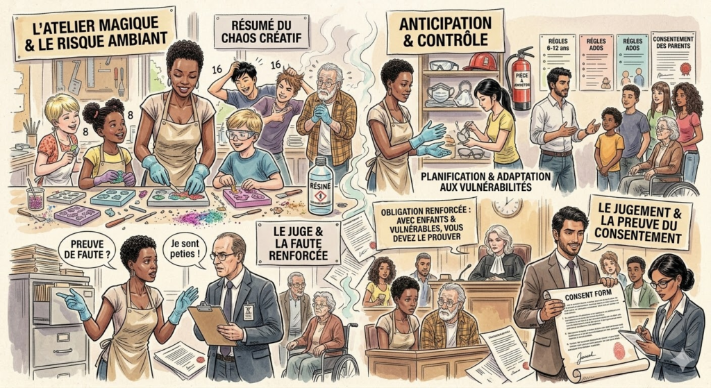 En cas d’incident (projection dans l’œil, ingestion, malaise à cause des odeurs, comportements inadaptés d’un encadrant), vous ne serez pas jugé comme pour un simple atelier loisirs : le juge regardera si vous avez anticipé la vulnérabilité, adapté l’activité, encadré les intervenants et respecté les règles sur le consentement et les données personnelles.