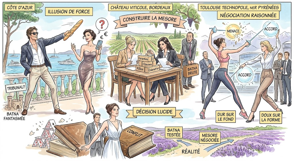 Beaucoup d’acteurs confondent posture et réalité. Dire « j’irai au contentieux » n’est pas une BATNA ; c’est une intention. La véritable alternative se mesure en coûts, délais, risques d’exécution, effets collatéraux (réputation, équipes, clients, investisseurs). Exemple : un associé sûr de “gagner au tribunal” découvre, trop tard, que la procédure bloque une cession stratégique pendant trois ans, avec une décote immédiate en due diligence.