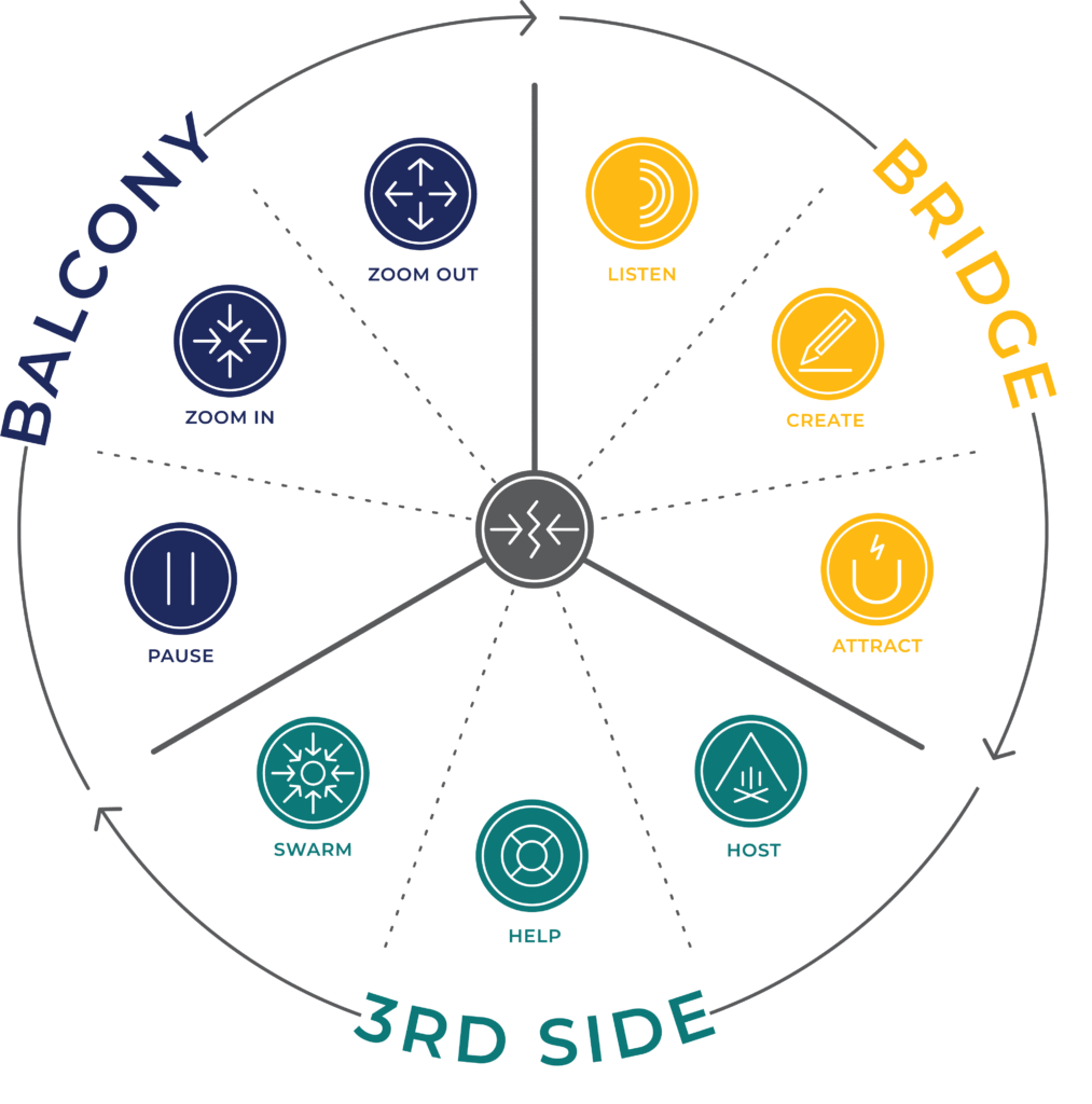 • Balcony : Position de recul (ou d’ « écart » si on adopte la vision du philosophe français François JULLIEN ?) pour réfléchir avant d’agir, ce qui permet de faire un choix libre. Exemple : en Inde, prévoir des étapes validées par la hiérarchie avant toute proposition.